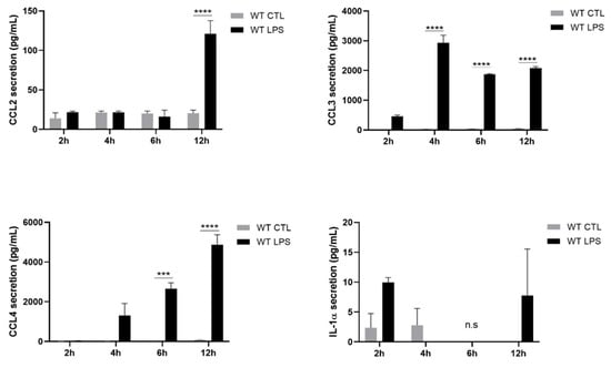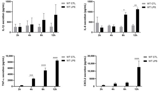 Secretion of cytokines in WT differentiated Hoxb8 cells stimulated with LPS. Differentiated Hoxb8 neutrophils were stimulated for 2, 4, 6, 12 h with 100 ng/mL of LPS. C-C motif chemokine ligand (CCL)-2, CCL3, CCL4, interleukin (IL)-1α, and tumor necrosis factor alpha (TNF-α) secretion was measured by cytokine cytometric bead array (CBA) analysis and IL-1β, IL-6 and C-X-C motif chemokine ligand 2 (CXCL2) secretion was quantified by ELISA. Results are presented as mean ± SEM of three independent experiments. * = p < 0.05; ** = p < 0.01; *** = p < 0.001; **** = p < 0.0001.