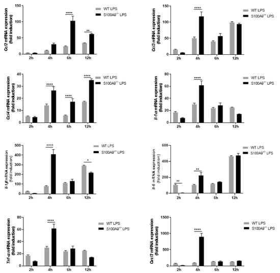 Effect of S100A9−/− on LPS-induced cytokine mRNA expression in differentiated Hoxb8 cells. Differentiated WT and S100A9−/− Hoxb8 cells were stimulated with 100 ng/mL LPS for 2, 4, 6 and, 12 h. Expression of Ccl2, Ccl3, Ccl4, Il-1α, Il-1β, Il-6, Tnf-α and Cxcl2 mRNAs was assessed by qPCR. Data normalization was performed using three reference genes (Actβ, B2m and Gusb) and expressed as fold induction compared to the non-stimulated control for both WT and S100A9−/−. Results are shown as mean ± SEM of three independent experiments. * = p < 0.05; ** = p < 0.01; **** = p < 0.0001.
