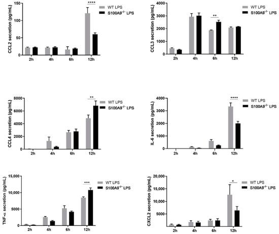 Effect of S100A9−/− on LPS-induced cytokine secretion in differentiated Hoxb8 cells. Differentiated WT or S100A9−/− cells were stimulated with 100 ng/mL of LPS for 2, 4, 6, 12 h. CCL2, CCL3, CCL4, and TNF-α secretion was measured by CBA analysis and IL-6 and CXCL2 secretion was quantified by ELISA. Results are presented as mean ± SEM of five independent experiments. * = p < 0.05; ** = p < 0.01; *** = p < 0.001; **** = p < 0.0001.