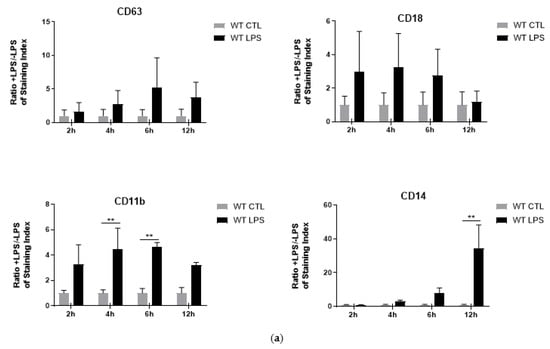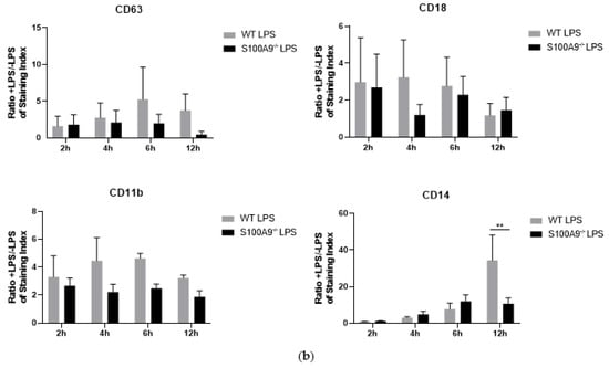 Effect of absence of the S100A9 protein in the process of degranulation. (a) Differentiated WT Hoxb8 cells were treated with 100 ng/mL LPS for 2, 4, 6 and 12 h. Translocation to the plasma membrane of selected granule markers (CD63 for azurophil granules, CD18 for specific granules, CD11b for gelatinase granules and CD14 for secretory vesicles) was assessed by flow cytometry. Results are expressed as a ratio of staining index (SI) of LPS-stimulated (+LPS) and non-stimulated (−LPS) cells at the same time point ± SEM of at least three independent experiments. Significantly different from non-stimulated control: ** = p < 0.01. (b) Differentiated WT or S100A9−/− cells were stimulated with 100 ng/mL of LPS for 2, 4, 6, 12 h. Translocation to the plasma membrane of selected granule markers was assessed by flow cytometry. Results are expressed as a ratio of staining index (SI) of LPS-stimulated (+LPS) and non-stimulated (−LPS) cells at the same time point ± SEM of at least three independent experiments. Significantly different from non-stimulated control. ** = p < 0.01.