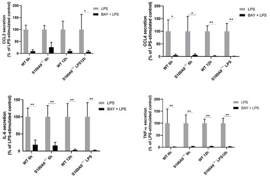 Relationship between NF-κB activation with S100A9-mediated cytokine secretion. Differentiated WT and S100A9−/− Hoxb8 cells were stimulated with 100 ng/mL of LPS for 2, 4, 6 and 12 h after pre-treatment for 30 min with 10 µM NF-κB inhibitor BAY 11-7082. CCL2, IL-6, CCL4 and TNF-α secretion was measured by ELISA and expressed as percentage of LPS-stimulated samples. The results were presented as mean ± SEM of five independent experiments. * = p < 0.05; ** = p < 0.01.