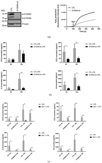 (a) Efficiency of S100A9 knock-down. Expression of S100A8 and S100A9 (left panel) in control and S100A9-shRNA differentiated HL-60 cells was determined by Western Blot. A representative Western Blot of three independent experiments is shown. ROS production (right panel) was measured in control and S100A9-shRNA differentiated HL-60 cells stimulated with fMLF (100 nM). A representative trace showing ROS production in control cells and S100A9-shRNA cells is shown. (b) Effect of S100A9 knock-down on LPS-induced cytokine secretion in differentiated HL-60 cells. Differentiated HL-60 cells (control and S100A9-shRNAs) were stimulated with 100 ng/mL of LPS for 6 and 12 h. CCL2, CCL3, IL-6, and IL-8 secretion was measured by CBA analysis. Results are presented as mean ± SEM of five independent experiments. * = p < 0.05; ** = p < 0.01. (c) Effect of inhibition of NF-κB activation in S100A9-mediated cytokine secretion. HL-60 cells (control and S100A9-shRNAs) were stimulated with 100 ng/mL of LPS for 6 and 12 h after pre-treatment for 30 min with 10 µM NF-κB inhibitor BAY 11-7082. CCL2, CCL3, IL-6, and IL-8 secretion was measured by CBA analysis. The results were presented as mean ± SEM of five independent experiments. * = p < 0.05; ** = p < 0.01.