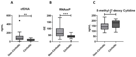 Serum levels of cell-free DNA (cf-DNA, ng/mL) (A), RNAse P coding DNA (GE: genomic equivalents) (B) and 5-methyl-2′-deoxycytidine (ng/mL) (C) in non-cirrhotic and cirrhotic patients with non-alcoholic fatty liver disease. Data are presented in whisker plots. Whisker plots show median values and 25–75th percentiles. * p < 0.05, ** p < 0.01, *** p < 0.001.