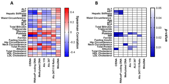 Heatmaps showing correlations between serum levels of cell-free DNA (cf-DNA), RNAse P coding DNA, methylated DNA assessed as levels of 5-methyl-2′-deoxycytidine, Alu115, Alu247, Alu247/Alu115 ratio and mitochondrial (mito) DNA with anthropometric and laboratory parameters of patients with non-alcoholic fatty liver disease. Heatmap (A) shows Spearman’s correlation coefficients according to their ranks and heatmap (B) shows their respective p-values (p-values > 0.05 are shown as white cells).