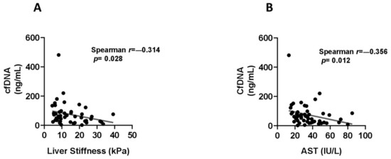 Correlations between serum levels of cell-free DNA (cf-DNA, ng/mL) with liver stiffness (A) and aspartate aminotransferase (AST) levels (B) using Spearman’s rank correlation coefficients.