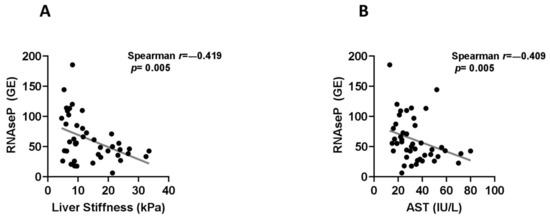 Correlations between serum levels of RNAse P coding DNA (GE: genomic equivalents) with liver stiffness (A) and aspartate aminotransferase (AST) levels (B) using Spearman’s rank correlation coefficients.