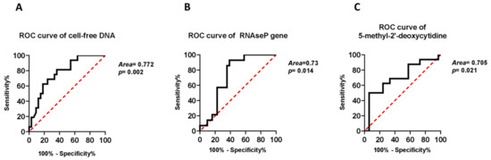 Area under receiving operating characteristic (ROC) curve of cf-DNA (A), RNAse P coding DNA (B) and 5-methyl-2′deoxycytidine (C) serum levels for the detection of NASH-related liver cirrhosis in NAFLD patients.