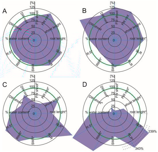 Spider plot of the selected growth parameters of the plants in response to naproxen. The data are shown as a percentage of the control; the green line indicates the control level. DW—dry weight, FW—fresh weight, RWR—root weight ratio, SWR—shoot weight ratio, RLR—root length ratio, SLR—shoot length ratio, R:S—root to shoot ratio. Values that are significantly different from the control by the unpaired Student’s t-test (p < 0.05) are marked with an asterisk. (A) Zea mays L., seven days after naproxen was added; (B) Zea mays L., 14 days after naproxen was added; (C) Solanum lycopersicum L., seven days after naproxen was added; (D) Solanum lycopersicum L., seven days after naproxen was added.
