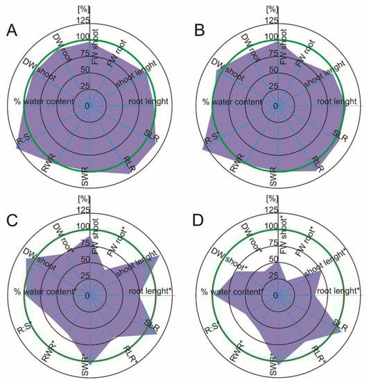 Spider plot of the selected growth parameters of the plants in response to diclofenac. The data are shown as a percentage of control; the green line indicates the control level of presented parameters. DW—dry weight, FW—fresh weight, RWR—root weight ratio, SWR—shoot weight ratio, RLR—root length ratio, SLR—shoot length ratio, R:S—root to shoot ratio, WC—water content. Values that are significantly different from the control by the unpaired Student’s t-test (p < 0.05) are marked with an asterisk. (A) Zea mays L., seven days after diclofenac was added; (B) Zea mays L., 14 days after diclofenac was added; (C) Solanum lycopersicum L., seven days after diclofenac was added; (D) Solanum lycopersicum L., seven days after diclofenac was added. In order to maintain the clarity of the D chart, a dashed line break for SLR and RLR was applied, and the percentage values were expressed in numbers.