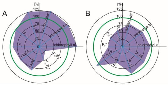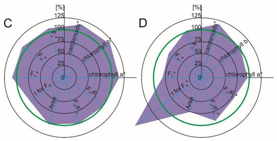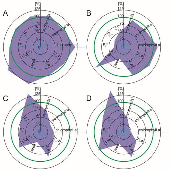 Spider plot of the selected photosynthetic parameters (the photosynthetic pigments and Chl a fluorescence parameters that characterize PSII) of the leaves in response to naproxen. The data are shown as a percentage of the control; the green line indicates the control level. F0—minimal fluorescence, Fm—maximal fluorescence, FV—variable fluorescence, Area—a total complementary area between the fluorescence induction curve and Fm, FV/Fm—maximum quantum efficiency of PSII after dark adaptation, Fv/F0—the ratio between the rate constants of the photochemical and nonphotochemical deactivation of the excited Chl molecules, T to Fm—time to reach maximal fluorescence. Values that are significantly different from the control by the unpaired Student’s t-test (p < 0.05) are marked with an asterisk. (A) Zea mays L., seven days after naproxen was added; (B) Zea mays L., 14 days after naproxen was added; (C) Solanum lycopersicum L., seven days after naproxen was added; (D) Solanum lycopersicum L., seven days after naproxen was added.