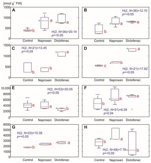 The effect of the selected NSAIDs on lipid peroxidation (MDA content) in the plant tissues. Each box of the boxplots includes the median (central red line), the 25th and 75th percentiles (the edges of the box), extreme data points (whiskers) and outliers (red pluses). The statistical analysis was performed based on the Kruskal–Wallis test (the values are presented in blue). The means with the same red letters close to the median are not significantly different from each other. A significance level of 5%, where ∝ = 0.05 (critical value) and a p (probability) value that was determined from the distribution of the test statistics were used for all of the analyses. Additionally, values that were significantly different from the control using the Mann–Whitney U test (p < 0.05) are marked with a (green) asterisk. (A) Zea mays L. root, seven days; (B) Zea mays L. root, 14 days, root; (C) Solanum lycopersicum L. root, seven days; (D) Solanum lycopersicum L. root, 14 days after drug administration; (E) Zea mays L. leaves, seven days; (F) Zea mays L. leaves, 14 days, root; (G) Solanum lycopersicum L. leaves, seven days; (H) Solanum lycopersicum L leaves., 14 days after drug administration.