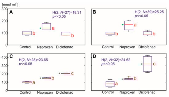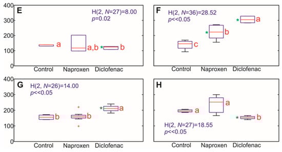 The effect of the selected NSAIDs on the hydrogen peroxide (H2O2) level in the plant tissues. Each box of the boxplots includes the median (central red line), the 25th and 75th percentiles (the edges of the box), extreme data points (whiskers) and outliers (red pluses). The statistical analysis was performed based on the Kruskal–Wallis test (the values are presented in blue). The means with the same red letters close to the median are not significantly different from each other. A significance level of 5%, where ∝ = 0.05 (critical value) and a p (probability) value that was determined from the distribution of the test statistics were used for all of the analyses. Additionally, values that were significantly different from the control using the Mann–Whitney U test (p < 0.05) are marked with a (green) asterisk. (A) Zea mays L. root, seven days; (B) Zea mays L. root, 14 days, root; (C) Solanum lycopersicum L. root, seven days; (D) Solanum lycopersicum L root., 14 days after drug administration; (E) Zea mays L. leaves, seven days; (F) Zea mays L. leaves, 14 days, root; (G) Solanum lycopersicum L. leaves, seven days; (H) Solanum lycopersicum L leaves., 14 days after drug administration.