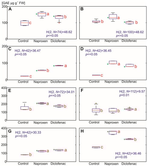 The effect of the selected NSAIDs on the total phenolic content in the plant tissues. Each box of the boxplots includes the median (central red line), the 25th and 75th percentiles (the edges of the box), extreme data points (whiskers) and outliers (red pluses). The statistical analysis was performed based on the Kruskal–Wallis test (the values are presented in blue). The means with the same red letters close to the median are not significantly different from each other. A significance level of 5%, where ∝ = 0.05 (critical value) and a p (probability) value that was determined from the distribution of the test statistics were used for all of the analyses. Additionally, values that were significantly different from the control using the Mann–Whitney U test (p < 0.05) are marked with a (green) asterisk. (A) Zea mays L. root, seven days; (B) Zea mays L. root, 14 days, root; (C) Solanum lycopersicum L. root, seven days; (D) Solanum lycopersicum L. root, 14 days after drug administration; (E) Zea mays L. leaves, seven days; (F) Zea mays L. leaves, 14 days, root; (G) Solanum lycopersicum L. leaves, seven days; (H) Solanum lycopersicum L. leaves, 14 days after drug administration.