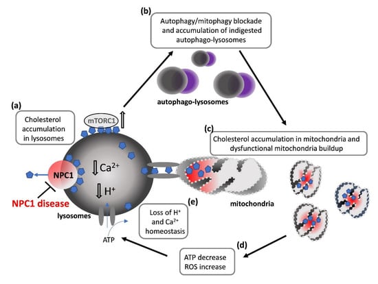 Cellular events involved in NPC1 disease: (a) cholesterol accumulation in lysosomes due to the loss of function of the cholesterol (ch) transporter NPC1; (b) autophagy/mitophagy blockade and accumulation of indigested autophago-lysosomes due to lysosomal accumulation of ch, ch-induced hyperactivation of the anti-autophagy complex mTORC1; (c) accumulation of dysfunctional mitochondria due to accumulation of ch in mitochondria and mitophagy blockade; (d) ATP production decrease and ROS increase by dysfunctional mitochondria; (e) loss of lysosomal ionic homeostasis. Blue pentagons: cholesterol.