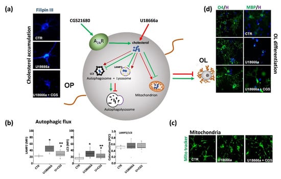 Given the modulatory role of A2AR in the differentiation of OLs and considering that a delay in oligodendroglial maturation seems to be the cause of the dysmyelination pathology in NPC disease, we decided to analyze the impact of its stimulation on OPs maturation []. To this aim, we exposed primary cultures of OPs to U18666a, an inhibitor of cholesterol transport usually used to induce an NPC-like phenotypes in vitro []. As expected, U18666a induced typical features of NPC1 phenotype such as intracellular accumulation of cholesterol, abnormal mitochondrial depolarization, and impaired autophagy. Moreover, it caused a maturational arrest of OPs as demonstrated by the decrease in the percentage of O1 (immature OLs) or MBP (non-myelinating mature OLs)-positive cells. The treatment with CGS21680 overcame the maturation arrest (demonstrated by the increase in the percentage of O4, O1 and MBP expressing cells) induced by U18666a and restored the complex, arborized morphology of cells []. Interestingly and in agreement with Coppi and co-workers, in control cultures (i.e., in absence of U18666a) CGS21680 induced an arrest in OLs differentiation as indicated by the decrease in the percentage of O1 and MBP expressing cells []. The opposite effect of A2AR stimulation in healthy and in NPC1 cells could indicate a profound functional change of this receptor induced by intracellular cholesterol accumulation and by its consequent depletion in the membrane. Indeed, a reduction in membrane cholesterol concentration such that occurring in NPC [] can inhibit the activity of A2AR as indicated by the reduction in cyclic adenosine monophosphate (cAMP) production []. Such a “double-faced effect” of A2AR stimulation has been already observed in other pathological conditions such as in HD; in fact, in HD mice (the R6/2 model) CGS21680 potentiated the toxicity induced by NMDA receptor stimulation in WT mice but attenuated it in HD littermates []. Thus, we can hypothesize that in physiological conditions, an overactivation of the receptor can result in a maturation arrest of OLs, but the lysosomal entrapment of cholesterol caused by U18666a, can reduce its tonic activation; consequently, receptor stimulation exerted by CGS21680 can restore the basal signaling necessary for the proper maturation of OLs. Together with the beneficial effect observed on differentiation of OLs, our data also demonstrated that the stimulation of A2ARs reduced intracellular cholesterol accumulation, mitochondria abnormalities and rescued from the unbalanced autophagic flux induced by U18666a in OPs (Figure 3) [].