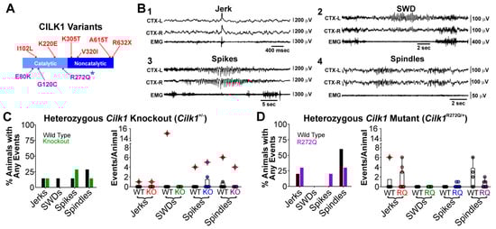 We first evaluated the spontaneous seizure phenotype of Cilk1+/− and Cilk1R272Q/+ mutant mice with their respective wildtype littermates using chronic video-ECoG/EMG recordings. Common electrographic events observed in JME patients include myoclonic jerks, generalized tonic–clonic seizures, polyspikes, and absence seizures. These events have readily observable correlates in mice (Figure 1B). We also catalogued sleep spindles (Figure 1B) to determine if Cilk1 mutations contribute to abnormal sleep activity among the three mouse types (i.e., Cilk1+/−, Cilk1R272Q/+, and wildtype). Investigators were blinded to the genotype of mice throughout the experimental procedure and data analysis.