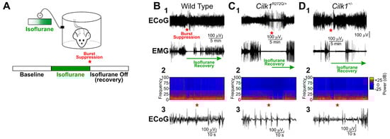 To record ECoG/EMG activity in behaving mice before and during isoflurane exposure, we used plethysmography chambers to reduce the variability of isoflurane gas exchange among mice. While recording ECoG/EMG signals in Cilk1+/− and Cilk1R272Q/+ mice, and their respective wildtype littermate, we supplied plethysmography chambers with atmospheric oxygen (21% O2) containing 0% isoflurane. After recording the baseline activity for 45 min, we then switched to oxygen containing either 1.5% or 5% isoflurane; all mice were subjected to both 1.5% and 5% isoflurane, with sufficient rest time between exposures. To match the method of Bailey et al. [], 1.5% isoflurane was chosen, while 5% isoflurane was chosen to rapidly induce anesthesia and potentially increase the probability of an isoflurane-induced electrographic and behavioral generalized tonic–clonic seizures. Isoflurane was delivered to mice until burst suppression was observed in the ECoG recording (e.g., Figure 2B3), indicating that isoflurane was maximally effective. Once burst suppression was observed, isoflurane delivery was halted and the animal was allowed to recover (i.e., “isoflurane recovery”). As before, video and ECoG/EMG signals were simultaneously captured. Collectively, we observed nearly identical behavioral patterns among all mice subjected to isoflurane. In total, 50% (n = 2/4) of Cilk1+/−, 15% (n = 2/13) of Cilk1R272Q/+, 50% (n = 1/2) of WT littermate controls for Cilk1+/−, and 50% (n = 1/2) of WT littermate controls for Cilk1R272Q/+ exhibited moderate head bobbing, tail extension, and occasional back and/or neck arching. These behavioral reactions were similarly consistent with opisthotonos but did not associate with any particular genotype. Importantly, the opisthotonos-like behavior did not align with any corresponding electrographic activity consistent with generalized tonic–clonic seizures in the ECoG/EMG recordings (Figure 2B–D); when present, generalized tonic–clonic seizures are readily apparent in the ECoG spectrogram. Thus, our data do not support the hypothesis that isoflurane induces generalized tonic–clonic seizures in either Cilk1+/− or Cilk1R272Q/+ mice.