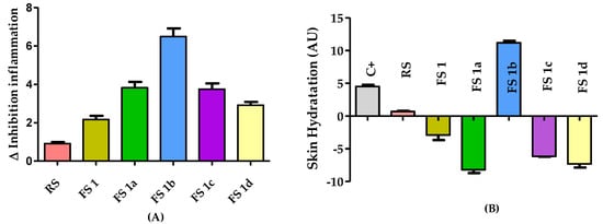 Figure 2B shows the skin hydration results for rat ears as the difference in stratum corneum hydration (SCH) after the FS treatments and the basal conditions as arbitrary units (AU). All the treatments reduced the skin hydration, but FS1b was an effective treatment and able to increase skin hydration at the same time.
