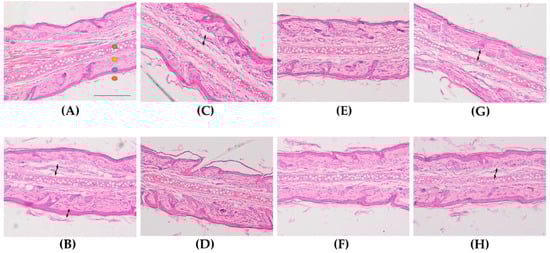 For the assessment of the anti-inflammatory activity of the formulations, histological analysis of ear sections was performed (Figure 3). A mild inflammation was observed in ears treated with AA (Figure 3B), characterized by edema and increased epidermal thickness. Topical administration of the reference drug slightly decreased these inflammatory indicators. Histological analysis of the ear of FS-treated animals showed different degrees of reduction of the edema (Figure 3D–H). In this regard, FS1b (Figure 3F) was the best formulation in diminishing the inflammation induced by AA, showing even better results than the reference drug (Figure 3C). Moreover, FS1 and FS1a also showed less edema, although FS1 showed greater presence of leukocyte infiltrate. Furthermore, FS1c and FS1d were also able to reduce the edema but to a lower degree than FS1 and FS1a.