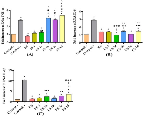 Relative expression of cytokines: (A) TNF-α; (B) IL-6; (C) IL-1β. Non-treated rats (Control −), rats treated only with AA (Control +), rats treated with diclofenac sodic solution (reference anti-inflammatory drug) after inducing inflammation (RS), rats treated with flavanone solutions FS1, FS1a- FS1d. Significant difference between Control + (*), Control − (•), RS (‡), FS1 (#), FS1a (▪), FS1b (†), FS1c (◊); (###,•••) p < 0.05; (▪ ▪, ••) p < 0.01; (*, •, ‡, #, ▪, †, ◊) p < 0.001 by non-parametric Tukey’s t-test (n = 5).