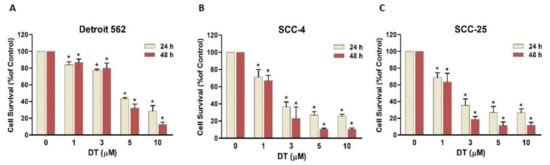 2.1. DT Inhibited Cell Survival of Human HNSCCs Cells