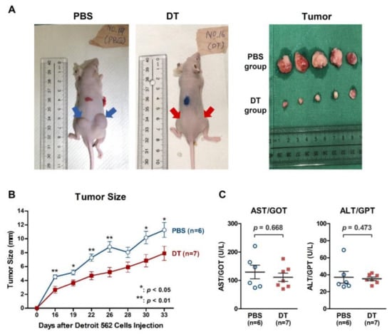 2.5. DT Suppressed Detroit 562 Tumor Growth in BALB/cAnN.Cg Nude Mice