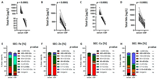 Changes of the total transition metal concentrations and of their relative distribution in size fractions from serum to corresponding CSF. (A–D) All four trace elements were significantly lower in CSF than in corresponding serum samples. (E) Changes of the Fe concentrations show a decrease for the 400–600 kDa and an increase for the 0.7–2 kDa fraction in CSF. (F) Changes of the Zn concentrations show a decrease for the 400–600 kDa and an increase for the 40–80 kDa fraction in CSF. (G) Changes of the Cu concentrations show a decrease for the 400–600 kDa and an increase for the 40–80 kDa fraction in CSF. (H) Changes of the Mn concentrations show a decrease for the >1200 kDa and the 400–600 kDa and an increase for the 0.15–0.65 kDa fraction in CSF. Differences were calculated using two-way ANOVA followed by Bonferroni post hoc analyses (** p < 0.01; *** p < 0.001). ns = not significant.