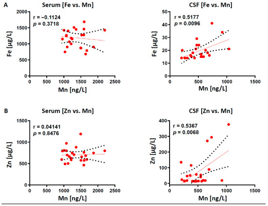 Pearson’s correlation analyses are shown for “Fe vs. Mn” and “Zn vs. Mn” interactions in 24 matched serum and CSF samples. (A) “Fe vs. Mn” is positively correlated only in CSF, but not in matched serum samples. (B) “Zn vs. Mn” is positively correlated only in CSF, but not in matched serum samples. “r” marks the linear Pearson correlation coefficient.