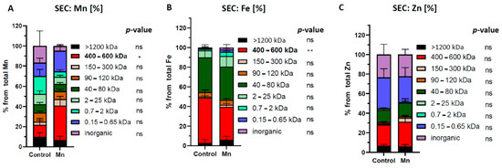 Comparison of relative element distribution in size fractions from brain extracts of control or orally Mn-exposed rats (backup samples from [55] were used). (A) Following Mn exposure only the Mn concentration of the 400–600 kDa fraction (containing α-2-macroglobuline) is significantly increased compared to controls (n = 6). (B) In Mn-treated brain samples the Fe concentration in the 400–600 kDa fraction (containing ferritin) is significantly decreased compared to controls (n = 6). (C) No significant changes between control and Mn-exposed brains were observed in Zn-containing fractions (n = 6). Differences were calculated using two-way ANOVA followed by Bonferroni post hoc analyses (* p < 0.05; ** p < 0.01). ns = not significant.