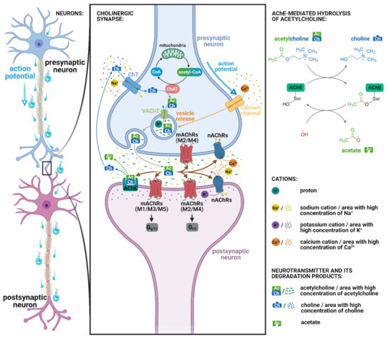 Left: Connection of presynaptic and postsynaptic neuron. Middle: Simplified illustration of cholinergic synapse with the mode of action of acetylcholine. The influx of Ca2+ into the presynaptic neuron caused by action potential is mediated via calcium channels and results in synaptic vesicle fusion to the active zone membrane of the presynaptic neuron. The subsequent acetylcholine release into the synaptic cleft enables the activation of acetylcholine receptors on the postsynaptic membrane. The acetylcholine breakdown mediated by acetylcholinesterase generates acetate and choline. Molecules of choline are reabsorbed by presynaptic neuron via choline transporters. Choline acetyltransferase-mediated acetylation of choline regenerates acetylcholine. Then, the neurotransmitter is transported into the synaptic vesicle and stored until the next use. Top-right: Simplified scheme of acetylcholine hydrolysis by acetylcholinesterase with subsequent enzyme regeneration. Bottom-right: Legend of involved cations, neurotransmitter, and its degradation products. Abbreviations: Ac, acetate (or acetyl group if combined with choline); AChE, acetylcholinesterase; Ch, choline; ChAT, choline acetyltransferase; ChT, choline transporter; CoA, coenzyme A; Gi/o and Gq/11, G proteins; mAChRs, muscarinic acetylcholine receptors; nAChRs, nicotinic acetylcholine receptors; VAChT, vesicular acetylcholine transporter. Created with BioRender.com.
