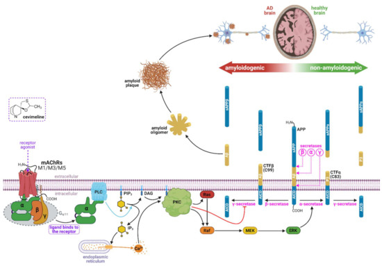 It seems that M1AChRs could represent an important target that affects all major features of AD, such as cholinergic deficiency, cognitive dysfunction, Aβ, and tau pathology. Positive effects of muscarinic agonists have been demonstrated in several cell culture studies [74,75,76,77], animal models [78,79], and AD patients [72]. In experiments, cevimeline increased αAPPs, decreased Aβ levels, decreased tau hyperphosphorylation, and blocked Aβ-induced neurotoxicity in vitro (Figure 4). In cognitive tests, it had a positive effect on deficits and showed excellent therapeutic safety, even with various types of administration.