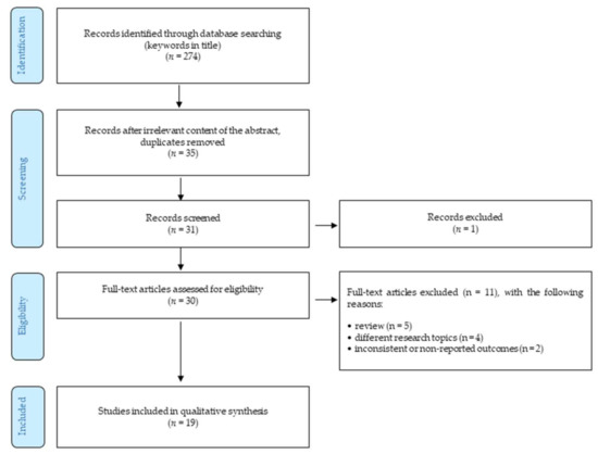 Altogether, 274 studies were identified in all these databases. The following selection consisted of removing duplicates and studies unrelated to the research topics (considering title/abstract) and provided 35 English-written studies. Of these, the authors selected 30 articles relevant for the research topic. These studies were fully investigated and considered against the following inclusion and exclusion criteria: