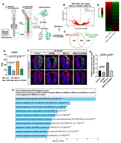 Electroporations were carried out as described in a previous section but with 5 bilateral pulses, with the protocol described in [12]. Results for pCIG (2 µg/µL), pCIG-MEK1ca (1 µg/µL + pCIG 1 µg/µL) and pCIG-HOXB8 (1 µg/µL + pCIG 1 µg/µL) were published in [12,27], and compared with the pCIG-MEK1ca + pCIG-HOXB8 (1 µg/µL of each) condition. Part of the neural tube expressing the GFP were dissected 18 h after electroporation and dissociated (Trypsin-EDTA 0.25%). GFP-expressing cells were isolated by FACS with the use of a dead cell exclusion (DCE)/discrimination dye (DAPI) to eliminate dying cells [12]. RNA was extracted (RNeasy Mini Kit) and reverse transcribed and cDNA was amplified using a linear amplification system and used for sequencing library building (GATC): random primed cDNA library, purification of poly-A containing mRNA molecules, mRNA fragmentation, random primed cDNA synthesis, adapter ligation and adapter specific PCR amplification, Illumina technology, 50,000,000 paired end reads with the 2 × 50 bp read length. Bioinformatics analyses were performed using the galgal4.0 chicken genome. Qualitative analysis of the RNA-Seq data from the four biological replicates showed a high Pearson correlation coefficient (>0.99) indicative of experimental reproducibility (Figure S4). The RNA-seq data discussed in this publication have been deposited in NCBI’s Gene Expression Omnibus [67] and are accessible through GEO Series accession numbers GSE162665, GSE182072 and GSE182076.