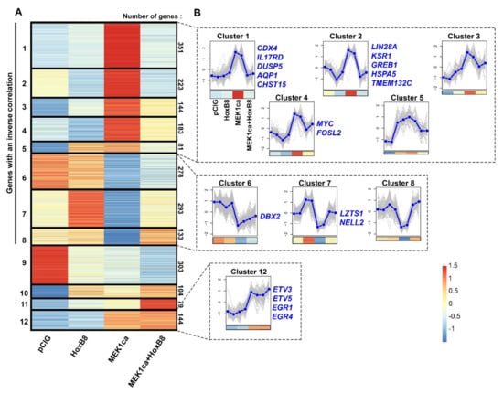 Clustering of genes deregulated by MEK1ca. (A) Heat map (z-scores derived from TPM values) of the 2316 genes deregulated in the “MEK1ca versus PCIG” condition (FDR5) clustered using k-means with k = 12 for the pCIG, HOXB8, MEK1ca and MEK1ca + HOXB8 conditions. 1686 genes (72.8%, clusters 1–8) display an inverse correlation between the “MEK1ca versus pCIG” and “MEK1ca + HOXB8 versus MEK1ca” conditions. Only 144 genes (6.2%, cluster 12) behave the same in the MEK1ca and MEK1ca + HOXB8 conditions (i.e., are not reversed by HOXB8). (B) Plots of clusters 1–8 and 12 with two replicates of each condition (control (pCIG1, pCIG2), HOXB8 (HOXB8-1 and HOXB8-2), MEK1ca (MEK1ca-1 and MEK1ca-2) and MEK1ca + HOXB8 (MEK1ca + HOXB8-1 and MEK1ca + HOXB8-2)), with the mean (in blue) and with the corresponding heat map in the bottom. Some representative genes of the clusters are on the right side of the corresponding cluster.