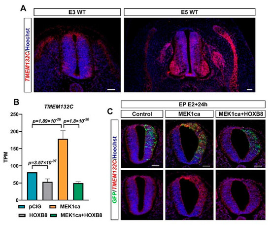 TMEM132C regulation by MEK1ca and HOXB8. (A) Fluorescence in situ hybridization with the TMEM132C probe on transverse trunk sections of wild-type chicken embryos at E3 and E5. (B) Mean expression of TMEM132C in TPM (transcripts per kilobase million) obtained for the two replicates of the control- (pCIG1, pCIG2), HOXB8- (HOXB8-1 and HOXB8-2), MEK1ca- (MEK1ca-1 and MEK1ca-2) and MEK1ca + HOXB8 (MEK1ca + HOXB8-1 and MEK1ca + HOXB8-2)-expressing samples, with the corresponding p-value according to the DGE of each pair. (C) Fluorescence in situ hybridization with the TMEM132C probe and immunofluorescence staining with the anti-GFP antibody on transverse trunk sections of chicken embryos one day post-electroporation in the pCIG, HOXB8, MEK1ca and MEK1ca + HOXB8 conditions.