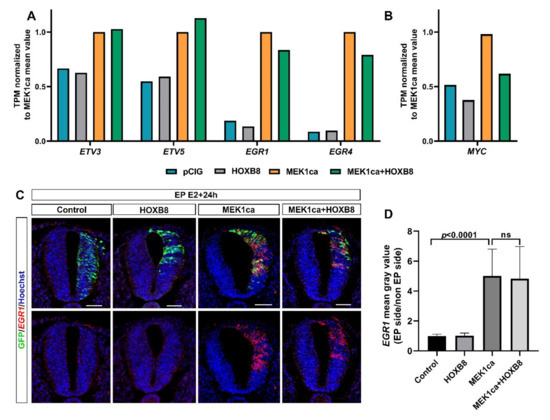 Clustering analysis of the RNA-Seq data also allowed regrouping together the genes not reversed by HOXB8 (expression not changed between the MEK1ca + HOXB8 versus MEK1ca condition). These genes, grouped in cluster 12, represents only 6% of the genes analyzed (114/2316) (Figure 3B, Table S5). Panther overrepresentation analysis for the biological process with these genes highlighted enrichment of the genes involved in the regulation of the cell-matrix adhesion, cell differentiation or regulation of transcription by RNApolII (Figure S8D). Surprisingly, among the genes of this category were included early growth response genes (EGR1 and EGR4) (Figure S8D) known to be important transcriptional regulators and to act as the convergent point between a variety of extracellular stimuli including the RAS/ERK pathway and activation of their target genes [19,45]. Indeed, while they were, as expected, upregulated by MEK1ca (MEK1ca versus pCIG), they were not reversed by HOXB8 (expression not changed between the MEK1ca + HOXB8 versus MEK1ca condition) (Figure 5A and Figure S10A). In situ hybridization with the EGR1 probe confirmed the dynamics of expression identified from the RNA-Seq data (Figure 5A,C). Other genes which behave the same are genes coding for ETS transcription factors ETV3 and ETV5 (cluster 12, Supplementary Table S5, Figure 3B, Figure 5A, Figures S8D and S10A), also known to be the downstream target of the FGF8/ERK pathway [46]. These results highlighted the specificity of the mechanisms leading to HOXB8 reversion of MEK1ca-induced neoplasia. Since other immediate early genes are however part of the genes reversed by HOXB8 expression, including c-MYC [19] (cluster 4, Figure 5B, Figures S10 and S11), the global transcriptional reversion of the MEK1ca phenotype by HOXB8 could rely on the transcriptional control of these genes by HOXB8 which might work as nodes of the global transcriptional regulation of the other genes. The MYC genes, which consist of three paralogs encoding transcription factors C-MYC, L-MYC and N-MYC, are among the most frequently deregulated driver genes in human cancer [47]. Since our transcriptomic data showed that HOXB8 inhibited the expression of all the three MYC genes in the trunk neural tube [12] (Figures S10B and S11), one simple explanation of the global transcriptional reversion of the MEK1ca-induced phenotype by HOXB8 is via MYC transcriptional inhibition, that could be direct or indirect. It fits at least for the LIN28A gene which is controlled at the transcriptional level via MYC [48]. However, we do not rule out that other genes such as FOS (FOSL2 gene is in the cluster 4, Figure 3B, Figure S9) or other immediate early genes also act as relay of MEK1ca targets reversed by HOXB8, or that HOXB8 acts more as a global epigenetic factor which controls transcription in direct competition with ERK or one (or few) of its key target effectors.