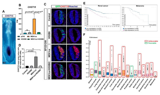 CHST15 upregulated by MEK1ca and reversed by HOXB8 is unfavorable for many cancers. (A) Dorsal view of a 2-day-old chicken embryo after whole mount in situ hybridization with a CHST15 probe highlighting its expression only in the most caudal part of the embryo. (B) Mean expression of CHST15 in TPM (transcripts per kilobase million) obtained for the two replicates of the control- (pCIG1, pCIG2), HOXB8- (HOXB8-1 and HOXB8-2), MEK1ca- (MEK1ca-1 and MEK1ca-2) and MEK1ca + HOXB8 (MEK1ca + HOXB8-1 and MEK1ca + HOXB8-2)-expressing samples, with the corresponding p-value according to the DGE (FDR5) of each pair. (C) Fluorescence in situ hybridization with a CHST15 probe and immuno-fluorescence staining with the anti-GFP antibody on transverse trunk sections of chicken embryos one day post-electroporation in the pCIG, HOXB8, MEK1ca and MEK1ca + HOXB8 conditions. Blue is Hoechst staining. Scale bar: 50 µm. (D) CHST15 staining mean gray value ratio (electroporated/contralateral side) one day after electroporation in the four conditions (n = 3 animals/18 sections) (two-tailed Mann–Whitney test, error bars represent the SD). (E) Survival analysis data from the Human Protein Atlas (courtesy of the Human Protein Atlas, www.proteinatlas.org, 15 May 2021) highlighting that CHST15 displays high expression correlated with poor outcomes in renal and melanoma human cancers. (F) RNA expression overview (RNA-Seq data in 17 cancer types as the median FPKM (fragment per kilobase of exon per million reads) generated by The Cancer Genome Atlas (TCGA) (Courtesy of Human Protein Atlas, www.proteinatlas.org, 15 May 2021)), to which we added a color code (red—unfavorable, green—favorable) to highlight that most cancers (15/17) have high expression correlated with poor outcomes in the survival analysis data (Human Protein Atlas).