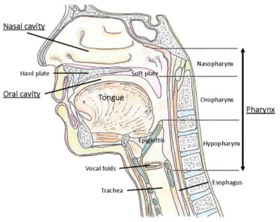 The upper respiratory tract refers to the nasal cavities, sinuses, pharynx including tonsils, and larynx (Figure 1). In contrast, the lower respiratory tract consists of the trachea and the lungs with their substructures including bronchi, bronchioles, and alveoli. The nasopharynx is mainly lined by ciliated columnar epithelium but stratified squamous epithelium occurs at its lower end where it joins the oropharynx. The oropharynx and hypopharynx are lined by largely non-keratinized stratified squamous epithelium. The lateral walls of the oropharynx are composed of the palatine tonsils and tonsillar pillars [43]. The laryngeal epithelium corresponding to the mechanically exposed areas, including the upper part of the epiglottis and the vocal cords, consists of stratified squamous nonkeratinized epithelium. In the rest of the larynx, including the lower part of the epiglottis, the laryngeal ventricle, and infraglottic areas, the epithelium is ciliated columnar pseudostratified with goblet cells [44].