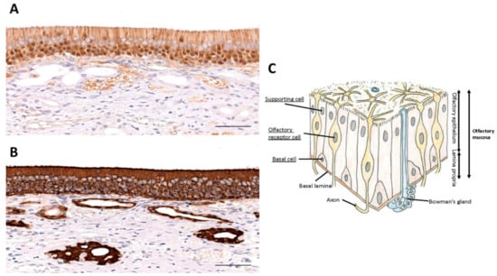 Human olfactory epithelium. (A) IHC staining with PGP9.5 showing neurons at the olfactory epithelium, which shows the olfactory sensory neurons. (B) IHC staining of cytokeratin18 showing the epithelial cells at the olfactory epithelium, showing supporting cells and Bowman’s glands. (C) Structure of olfactory epithelium showing the olfactory sensory neurons, supporting cells, basal cells and Bowman’s gland. Scale bars in (A,B) indicate 50 µm.