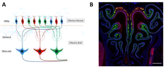 The ciliated columnar cells that are found in the respiratory epithelium have many cilia (~300) to remove sticky mucus from respiratory surfaces, whereas the number of cilia that emerge from the dendrite of an olfactory sensory neuron is relatively small, 5 to 30, and the olfactory cilia are almost immotile. The membrane of olfactory cilia houses olfactory receptor proteins. Odorant molecules that are inhaled when we breathe, bind to these olfactory receptor proteins, thereby transducing odorant molecules into intracellular signals which activate olfactory sensory neurons. Olfactory receptor proteins form a large gene family of G-protein coupled receptors that are expressed in the olfactory epithelium [102,103,104,105]. There are more than 1000 genes in the mammalian genome that encode the many different olfactory receptor proteins. However, not all of them are expressed and functional. In mice, 1400 genes are found in this olfactory receptor multigene family, whereas the gene family consists of around 400 functional and 600 pseudogenes in humans [106,107,108,109]. Despite the large number of olfactory receptor genes in the genome, a given olfactory sensory neuron expresses only one of them (one olfactory sensory neuron—one olfactory receptor rule) [102,110] (Figure 3A). The olfactory epithelium houses several million olfactory sensory neurons. The ones that express the same olfactory receptor project their axon to the same one or two glomeruli in the olfactory bulb, where the axon terminals form synaptic contacts onto central neurons. Moreover, the expression pattern of olfactory receptor genes presents itself as four different zones of the olfactory epithelium [111,112,113] such that olfactory sensory neurons that express the same olfactory receptor are found in only one of the four zones. Furthermore, the dorsal zone (Zone 1) and the three other zones (Zone 2 to 4) were found to have differences in the expression of the neural cell adhesion molecule known as olfactory cell adhesion molecule (OCAM) [114]. It was not expressed in the dorsal zone and only expressed in the rest of the zones, Zone 2 to 4 (Figure 3B).