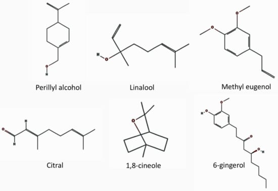 - Astani, A.; Reichling, J.; Schnitzler, P. Comparative Study on the Antiviral Activity of Selected Monoterpenes Derived from Essential Oils: Antiviral activity of monoterpenes derived from essential oils. Phytother. Res. 2010, 24, 673–679. [Google Scholar] [CrossRef]