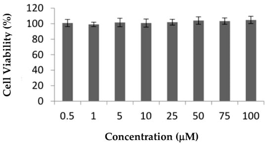 The antiproliferative activity was evaluated in human normal fibroblasts using the CellTiter 96® Aqueous Non-Radioactive Cell Proliferation Assay (Promega, Madison, WI, USA) and the 3-(4,5-dimethylthiazol-2-yl)-5-(3-carboxymethoxyphenyl)-2-(4-sulfophenyl)-2H-tetrazolium inner salt (MTS) as previously described [,]. MCF7 cells and normal human fibroblasts were plated into 96-well plates at 0.75 × 105 cells/well and allowed to adhere for 24 h. Then, DMEM medium was removed and replaced with fresh medium containing 0.5–100 μM compounds, 0.1–100 μM cisplatin, 0.1% (v/v) DMSO (vehicle control of compounds), or 0.09% (w/v) NaCl (vehicle control of cisplatin) and incubated in the same conditions. After 72 h of treatment, the medium was replaced by the MTS solution and the subsequent experimental procedures followed a previously described method []. Cell viability was evaluated by measuring the absorbance at 490 nm using a Bio-Rad microplate reader, model 680 (Bio-Rad, Hercules, CA, USA).