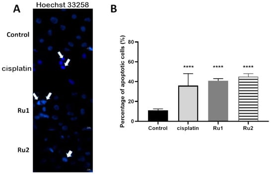 (A) Hoechst staining (excitation and fluorescence emission at 352 and 461 nm, respectively) of MCF7 cell line for visualization of apoptotic nuclei. Cells were grown in DMEM culture medium supplemented with 10% (v/v) fetal bovine serum in the presence of 0.1% (v/v) DMSO, the IC50 of cisplatin, the IC50 of Ru1, or the IC50 of Ru2 for 72 h. The arrows indicate an initial event of apoptosis such as chromatin condensation and nuclear fragmentation. The images were acquired using a ZEISS Microscope with ZEN software. (B) Percentage of apoptotic cells in MCF7 breast adenocarcinoma cell line after exposure to 0.1% (v/v) DMSO (vehicle control) or to the IC50 of each Ru(II) compound. The data are presented as the mean ± SEM of three independent experiments, and the statistical significance was evaluated in relation to the reference group (control) using the one-way ANOVA method followed by a Tukey multiple comparison test (**** p ≤ 0.0001).