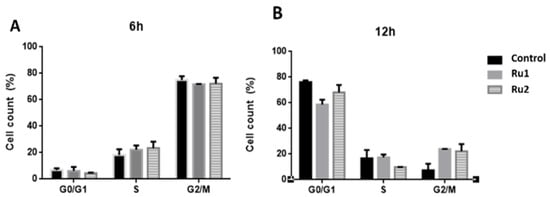 In the case of Ru2-treated cells, there was a difference in the S phase (9.8%) at 12 h when compared to control cells (16.6%), which was associated with an increase in the number of cells in the G2/M phase (22.1%) (Figure 5).
