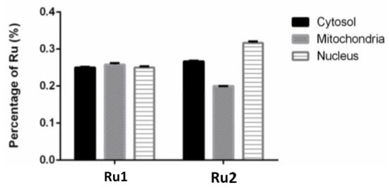 The knowledge of the subcellular distribution of the compound is fundamental in the elucidation of its mechanism of action []. The intracellular distribution of the compounds in the MCF7 cell line was studied using the Cell Fractionation Kit-Standard (ab109719, Abcam, Cambridge, UK). This kit allows the separation of cytosolic, mitochondrial, and nuclear fractions using detergents that take advantage of the characteristics and composition of different cell membranes. For both samples, the ruthenium content was determined using inductively coupled plasma atomic emission spectroscopy (ICP-AES) technique. We used at least 2× the IC50 concentration since the detection limits of ICP-AES did not allow us to use their respective IC50. After 6 h incubation, only 0.76% of Ru1 and 0.71% of Ru2 was found to be internalized by cells. As observed in Figure 6, when only considering the percentage of internalized compounds, both Ru1 and Ru2 were distributed among the cytosolic, mitochondrial, and nuclear fractions. No significant difference was observed in the amount of ruthenium among the three subcellular fractions (Figure 6). This distribution among the different fractions might indicate that these compounds might target different cellular components, in addition to DNA, which may contribute to the mechanism underlying their antiproliferative effect.