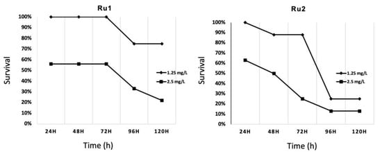 Survival evolution through time of 24 h post fertilization (hpf) zebrafish embryos exposed to ruthenium compounds at different concentrations; higher concentrations (5.0 and 10.0 mg·L−1) showed no survival at 24 h post treatment (hpt).