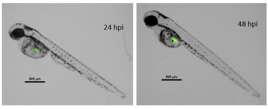 Toxicological analyses were previously developed on zebrafish embryos for full characterization of the compounds [,], following the OECD standardized protocol []. Nevertheless, due to the differences in the experimental conditions applied in the original toxicological evaluations to those applied here, new assays were developed. The embryo initial stage was delayed from 0 hpf to 48 hpf, the temperature was raised from 28 to 34 °C in 96-well plates, and the compounds were dissolved in 1% (v/v) DMSO water. After preliminary trials, both compounds were tested at 1.25, 2.50, 5, and 10 mg·L−1. Survival was checked every 24 h from 0 hpt (i.e., 48 hpf) to 120 hpt (168 hpf). The highest concentration without significant effects (high phenotypic effects or low survival) was chosen for each compound to expose the xenografted embryos and to evaluate the effect on the cancer cell population.