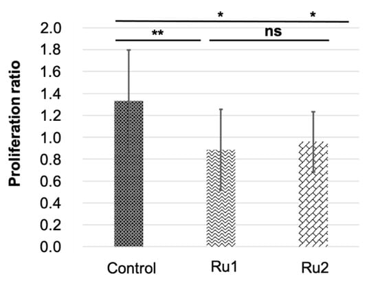 Xenografted zebrafish embryos were separated into three different treatments. One served as the control, with no drug exposition, whereas the two remaining groups were exposed to 1.25 mg·L−1 concentrations of Ru1 or Ru2. As expected, survival in fish groups did not show differences from controls. Cell proliferation was determined by the ratio of cancer cells (i.e., fluorescence) at 24 h post antitumor treatment to that 0 h post treatment (hpt) (Figure 8).