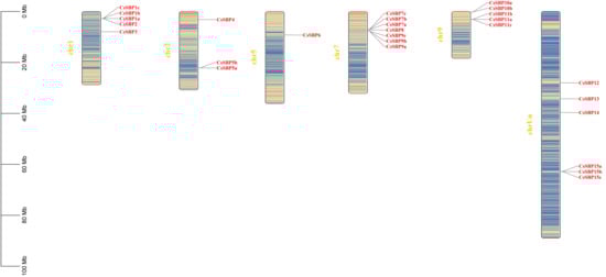 Chromosomal location of CsSBP genes. The scale represents 100 Mb chromosomal distance. The chromosome numbers are labeled above them. Gene densities were drawn based on the annotation information of C. sinensis genomes.