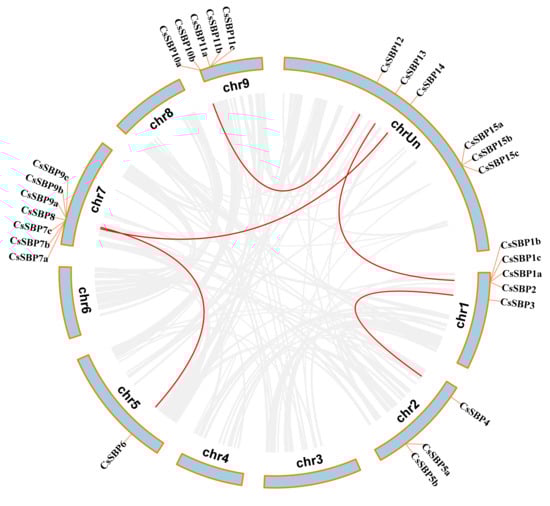 Duplication events of CsSBP genes. Circle plot showing duplication events of CsSBP genes on C. sinensis chromosomes. Red lines indicate duplication of CsSBP genes.